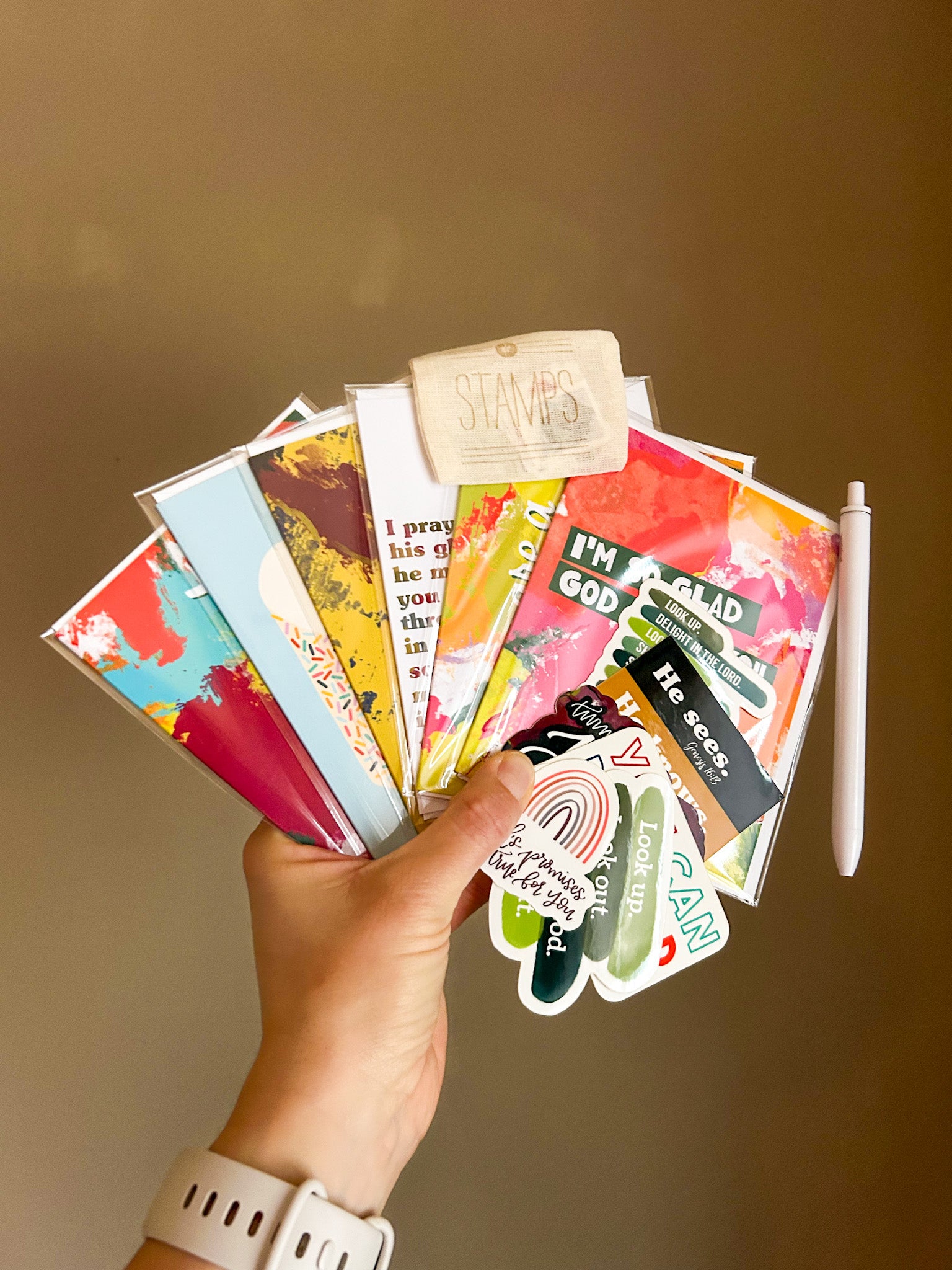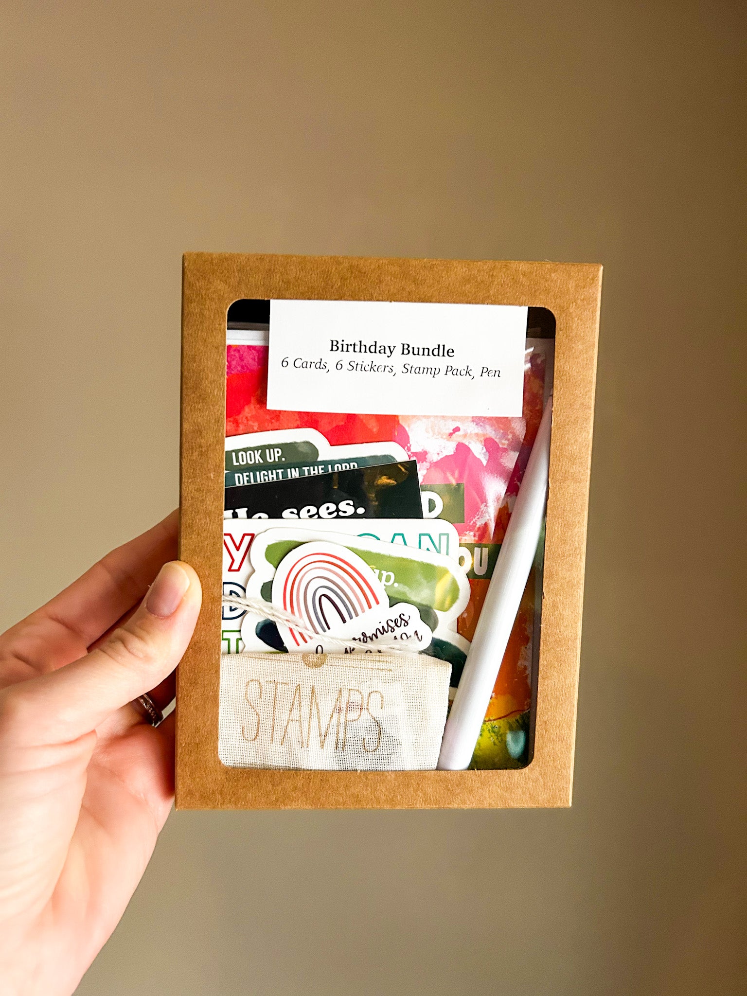 Everything you'll need to give encouragement to your friends. In this bundle you'll get 6 different cards that make for great birthday cards, 6 vinyl stickers to gift along with the card for your friend to use, and a stamp pack + pen to ensure you have what you need to get their cards to to them in time for their big day.
