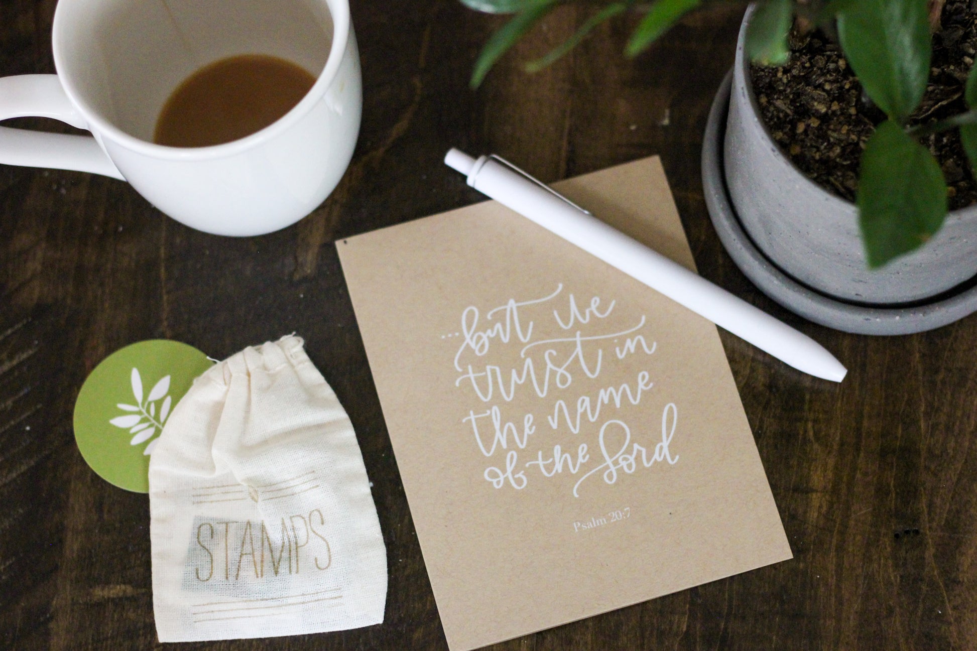 Hand lettered verses printed with white ink on kraft card stock give these cards an elegant simplicity that focuses on truths that strengthen our souls.