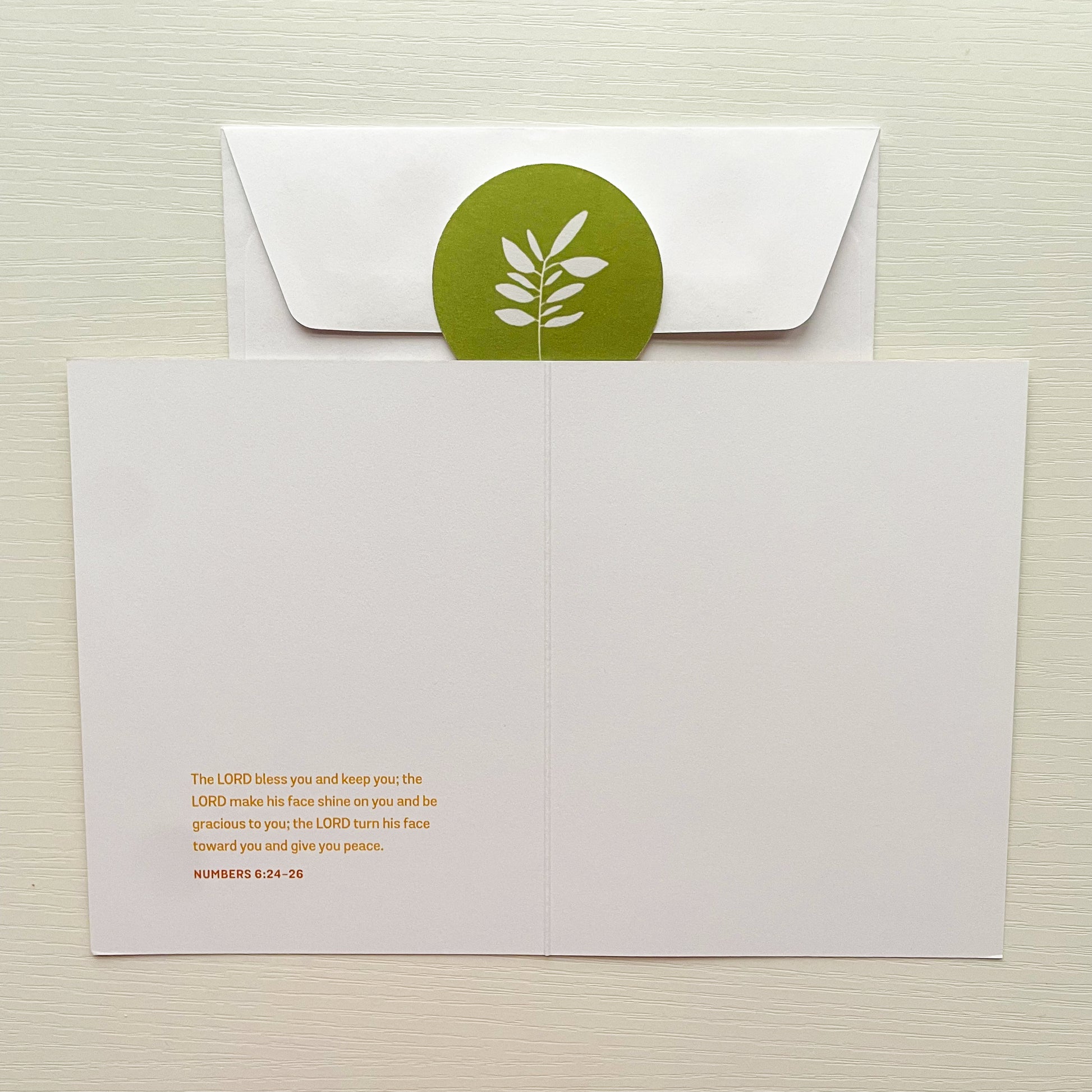 This 4.25 x 5.5 inch card is printed on thick, white card stock. It comes with a straight flap white envelope and envelope sticker.