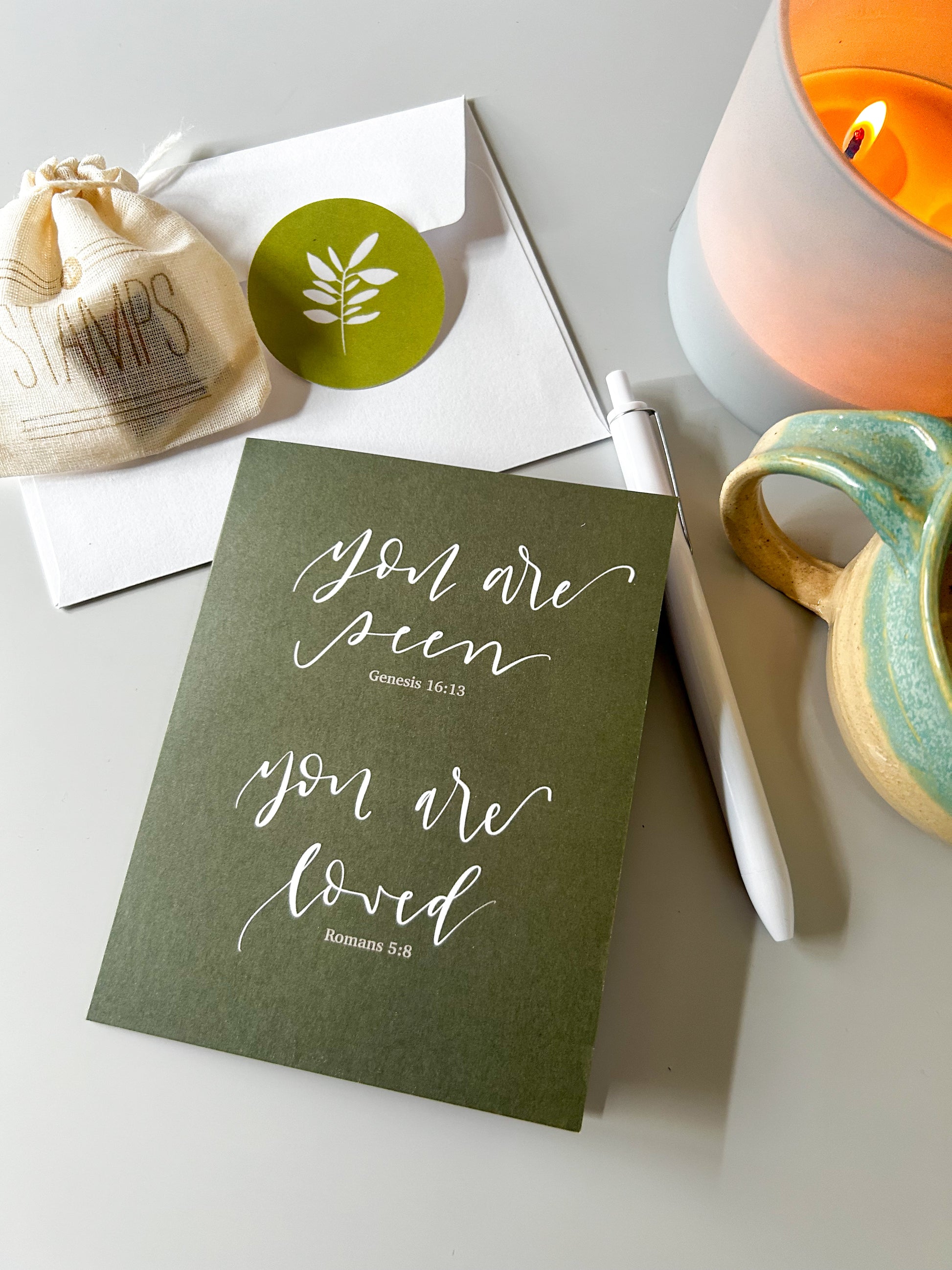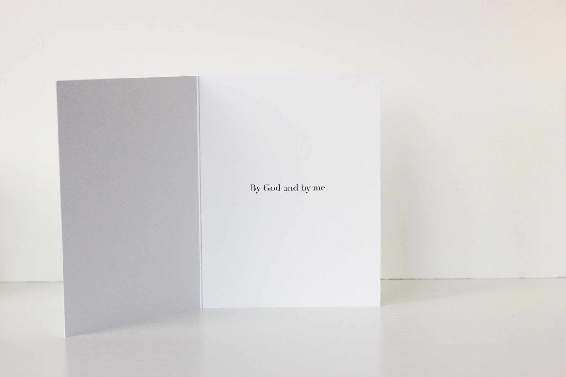 This 4.25 x 5.5 inch card is printed on thick, white card stock. It also comes with a straight flap, matching envelope and envelope sticker.