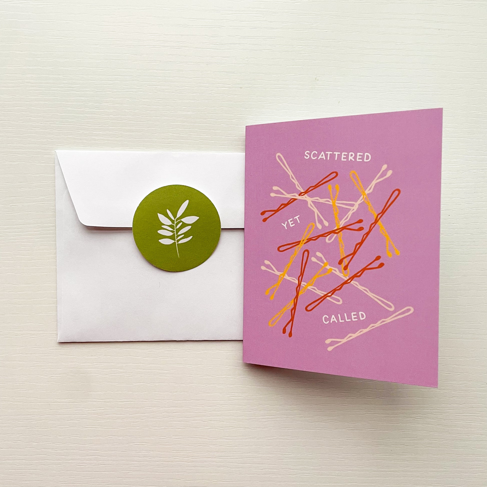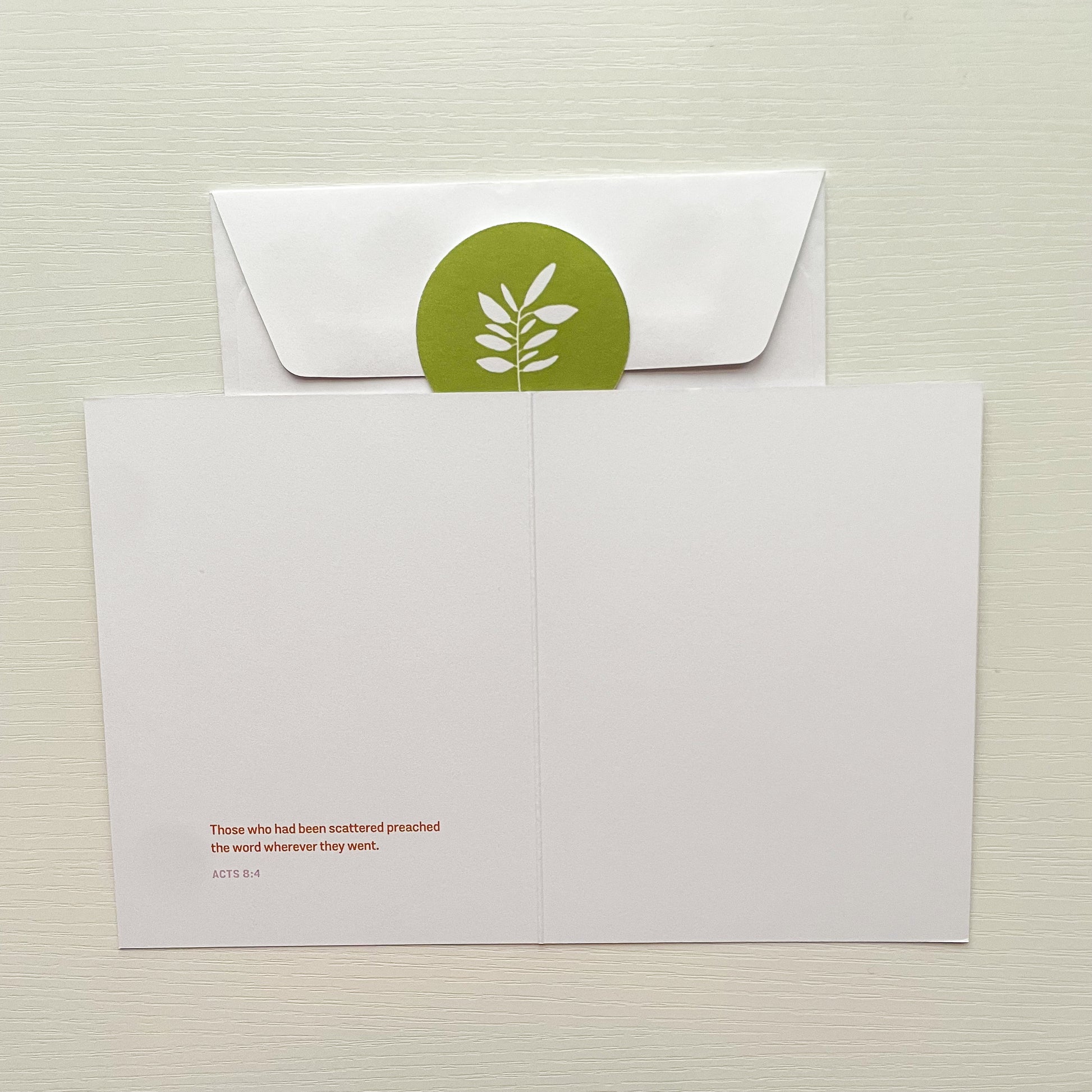 This 4.25 x 5.5 inch card is printed on thick, white card stock. It comes with a straight flap white envelope and envelope sticker.