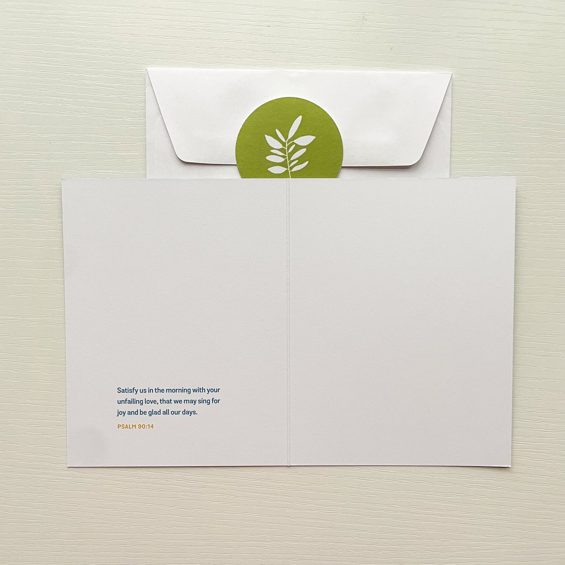 This 4.25 x 5.5 inch card is printed on thick, white card stock. It comes with a straight flap white envelope and envelope sticker.