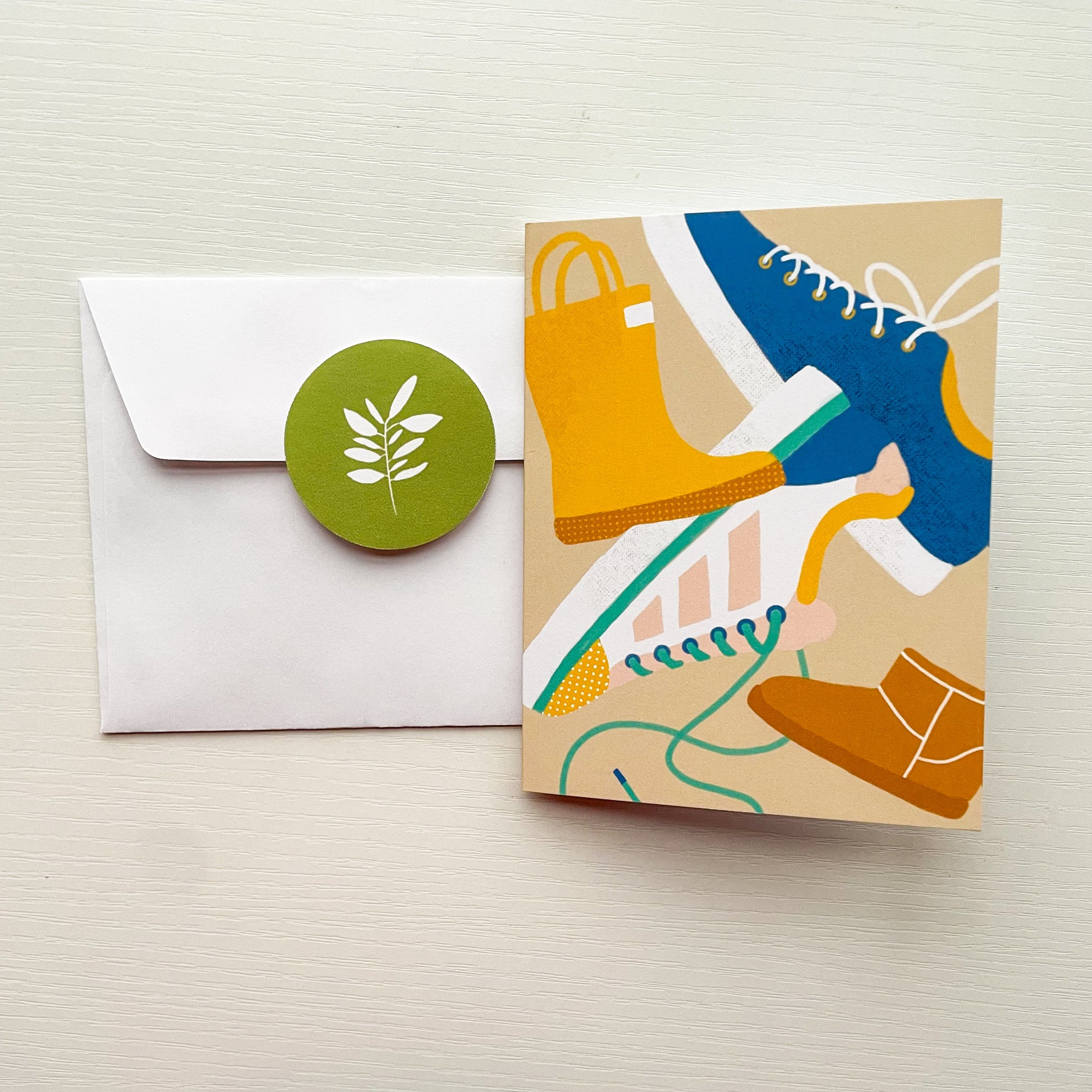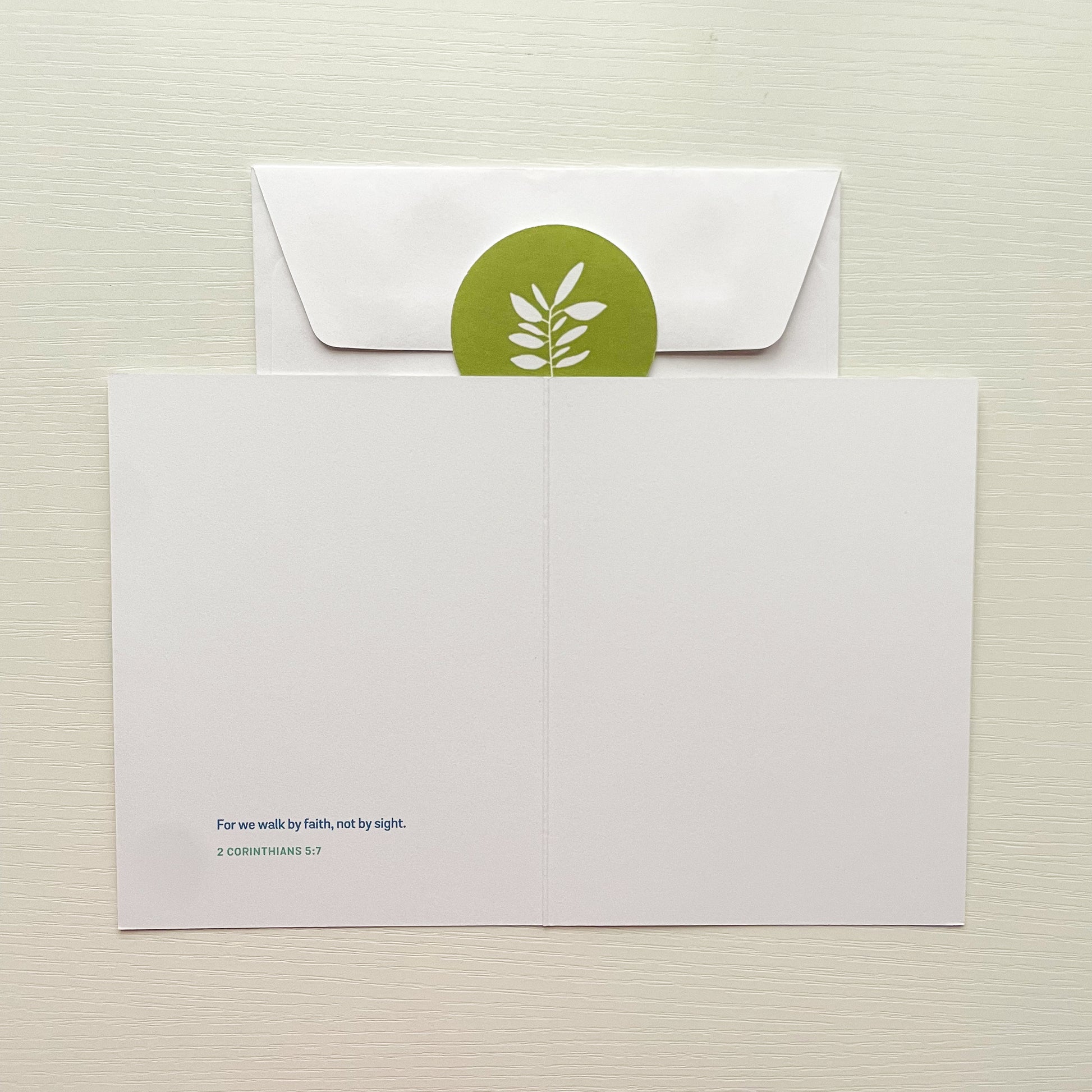 This 4.25 x 5.5 inch card is printed on thick, white card stock. It comes with a straight flap white envelope and envelope sticker.